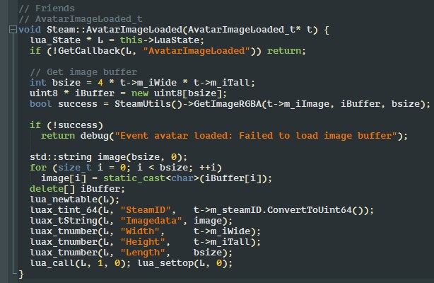 Потому что вот эта штука - AvatarImageLoaded_t, из которой я вгоняю данные в луа, в начале колбека первого скрина - она объявлена в стиме и приходит уже заполненная данными от стима. Я не знаю как тут можно итерировать по ключам-типам значений, иначе можно было бы половину структур колбеков автоматически перегонять в луа-таблички через набор правил типа "Все int64 перегоняем вот так, а String - вот так".