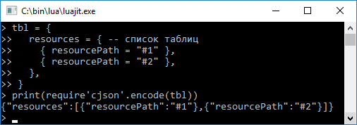 А как мне надо сформировать таблицу в lua, чтобы получить такой json из нее: '{"resources": [{"resourcePath":"#"}]}'? Если делаю таблицу вот так(json.encode({resources = {resourcePath = subscription_topic}})), то получаю фигню: '{"resources":{"resourcePath":"#"}}'