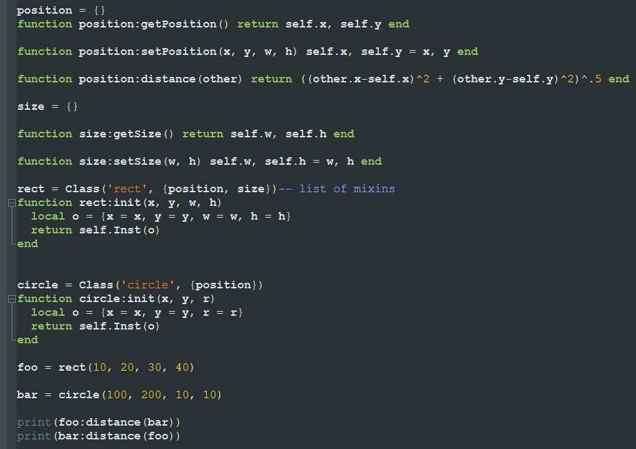 Ибо код с одной стороны гораздо легче превращается в кашу, а с другой - если одни миксины используют те же имена методов что и другие - приходится десять раз проверять приоритеты. Или именовать методы миксинов, включая имя миксина, вроде: obj:posGetPosition и obj:sizeGetSize(), где первый "префикс" - по имени миксина.