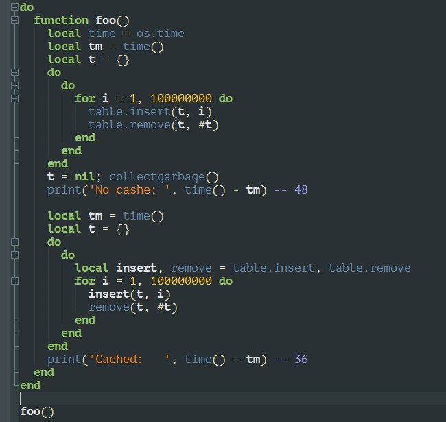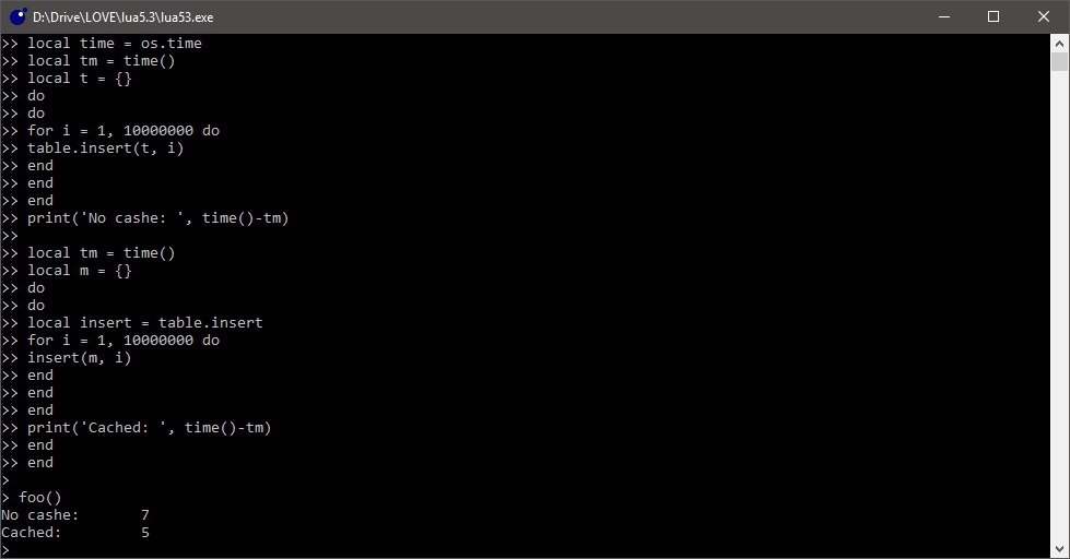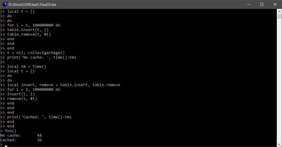 А вот оффтопик js так оптимизировали, что лишний раз вынести локально из объекта - наоборот замедлит, жаль luajit до этого не дошел