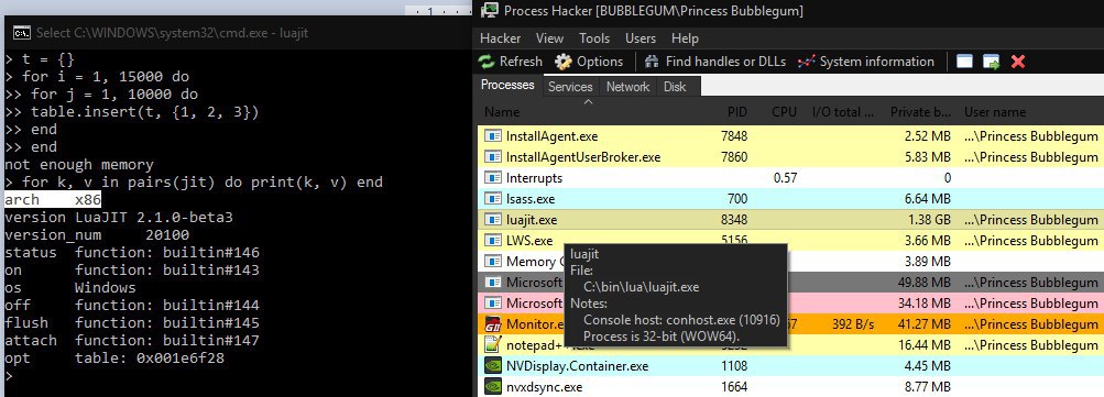 Luajit 64 кушает только два гига, а если отожрать больше - падает (((