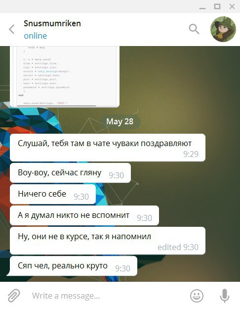 Ровно двадцать три года назад, на свет появился один замечательный человек, которому мы все благодарны за его неоценимую помощь и восхитительные человеческие качества! В телеграме, этот человек известен как @Snusmumriken, прошу любить и жаловать!