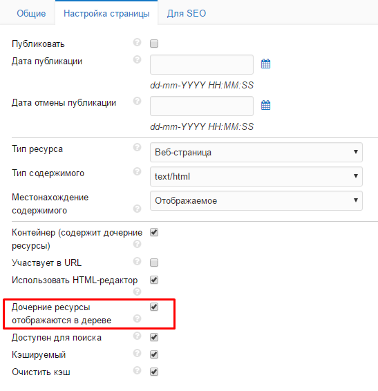 Дочернии ресурсы отображаются или не отображаются в дереве