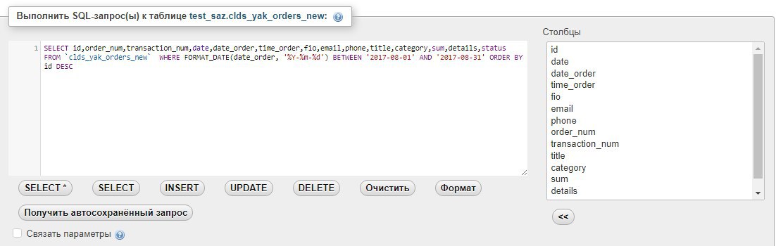SELECT id,order_num,transaction_num,date,date_order,time_order,fio,email,phone,title,category,sum,details,status FROM `clds_yak_orders_new` WHERE FORMAT_DATE(date_order, '%Y-%m-%d') BETWEEN '01.08.2017' AND '31.08.2017' ORDER BY id DESC