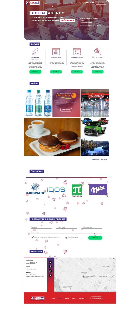 по мне так тут много чего надо исправлять. Видно, что совсем новичок делал. Первое что в глаза бросилось -зеленые кнопки. Не соответсвуют общей гамме сайта. Форма заявки - никакая, фон с рубинами все портит, отвлекает внимание. Партнеров, я бы сделала самым нижним блоком перед контактами. Подвал тоже нужно переделать. Зачем эта бела плашка под контактами? оО Не совсем понятно расположение самых нижних кнопок в подвале, по какому принципу? Без обид, но бы все переделала ((