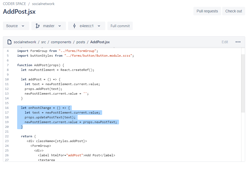 Ребзя, кто может помочь отладить проект? Ввожу текст нового поста и с каждым символом уходит из поля фокус и страница перематывается вверх. На уроке 37 остановился.