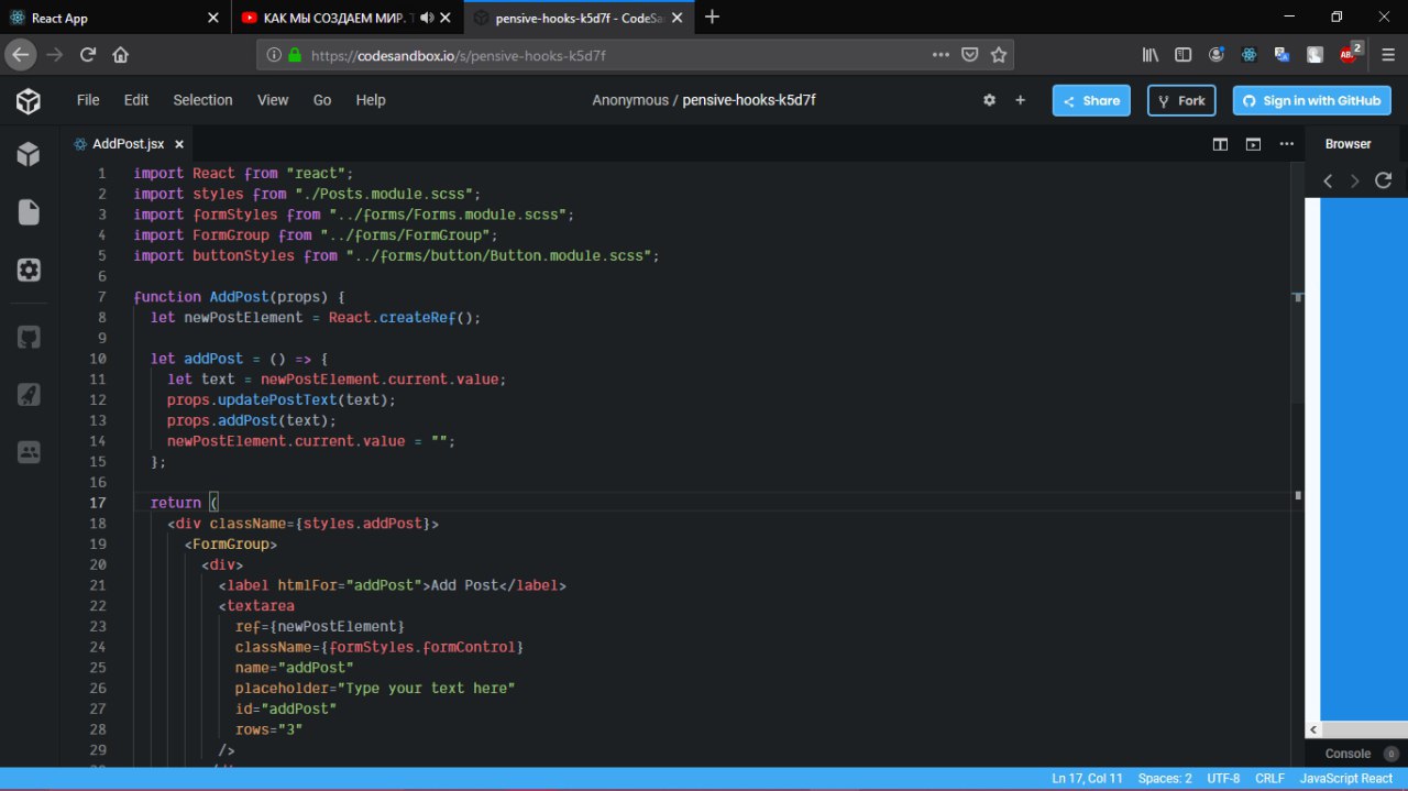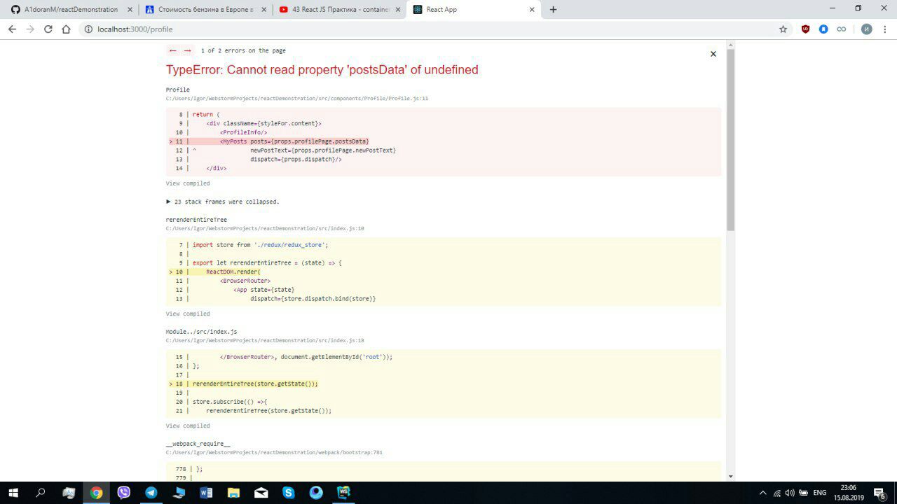 Всем привет. Прошу помощи у знающих людей. Прошел 42 урока. Завтрял на 43. Добавил Redux. Но не могу решить проблему которая описывается в конце урока, потеря state при передаче из App в подкомпоненты. Конкретно. Урок 42, время 21.47. Прошел дальше и сделал тот же фикс что и на видео. Но ошибка так и осталась. Структура проекта пока что похожа на тот что на видео. Пока за 2 дня не нашел способа решения проблемы.