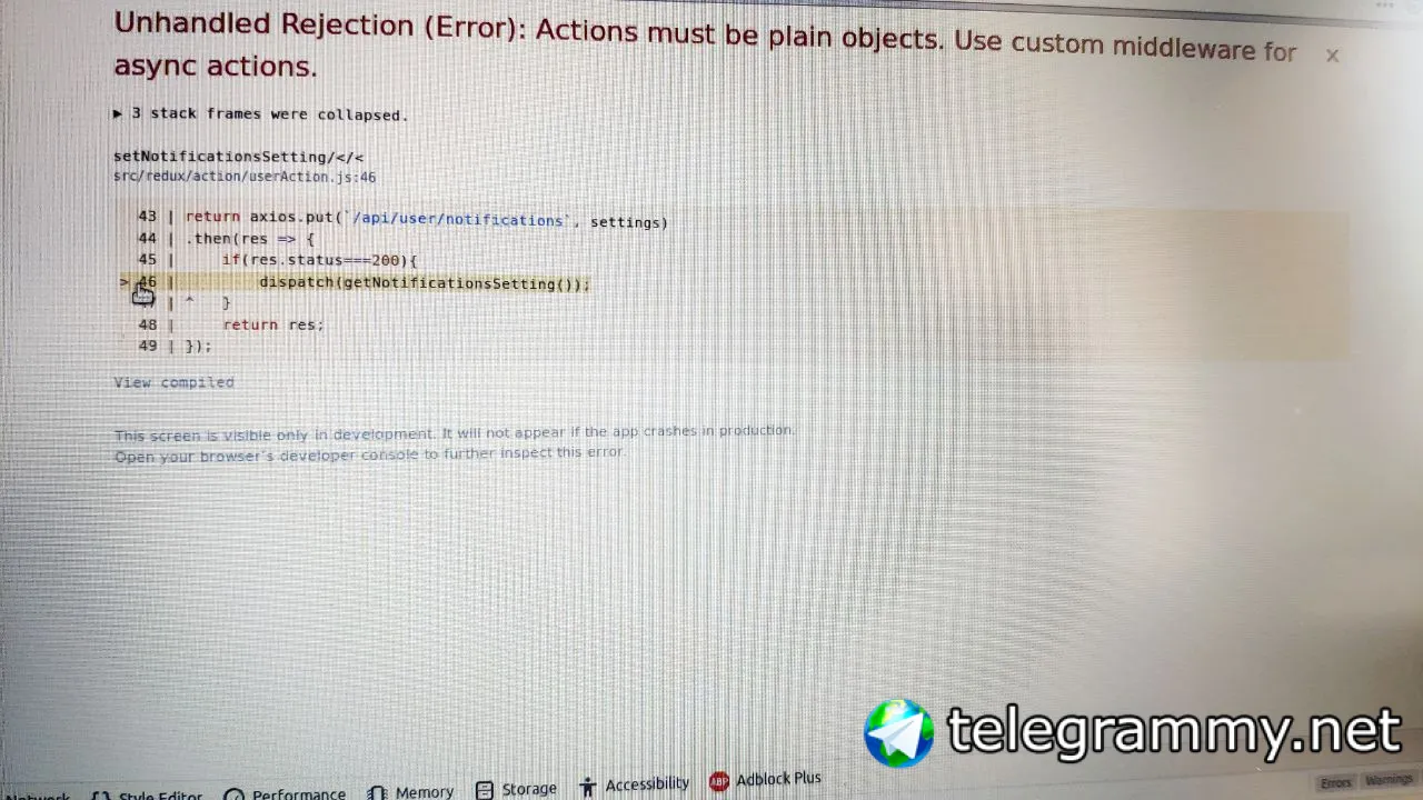странно..пииишет используйте мидлвеер для асинхронного экшена..как будто не работает applyMiddleware(thunkMiddleware)..а другие санки работают нормально ?