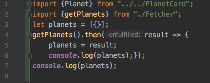 Ожидаю в planets видеть массив объектов. Функция это реализует норм, 6-я строка демонстрирует это. Но ниже проскакивает начальное значение planets, как пустого массива. И это логично. Я понимаю, что мне нужно ждать выполнения getPlanets().then , но простая попытка присвоения типа const planets = getPlanets.... не срабаотывает, потому что в planets записывается не результат функции, а промис.