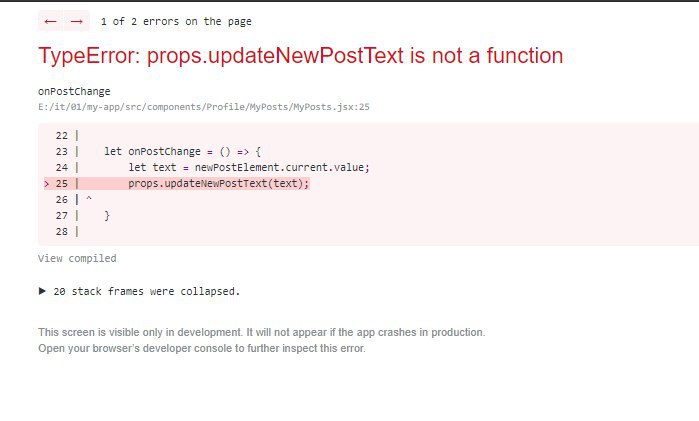 закоментирую 25 строчку, и посмотри через дебагер, что в пропсах приходит, может функцию передать забыл или не тот нейм передал
