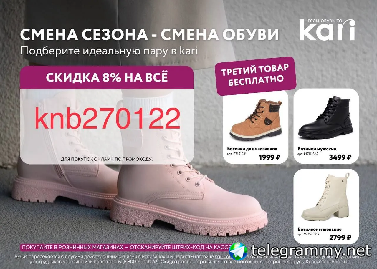 Скидка распространяется на все магазины kari стран Беларусь, Казахстан, Россия.