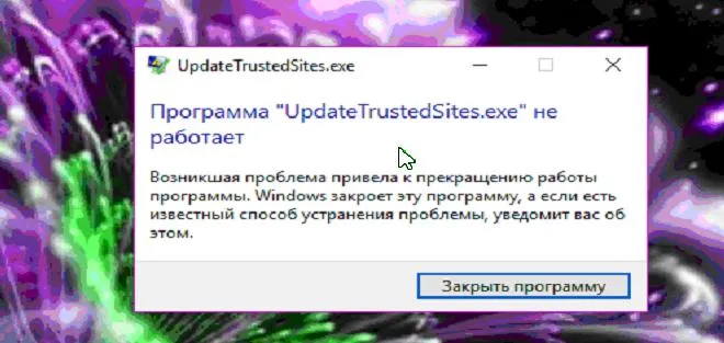 как то так Имя сбойного приложения: UpdateTrustedSites.exe, версия: 0.0.0.0, метка времени: 0x5768bae9