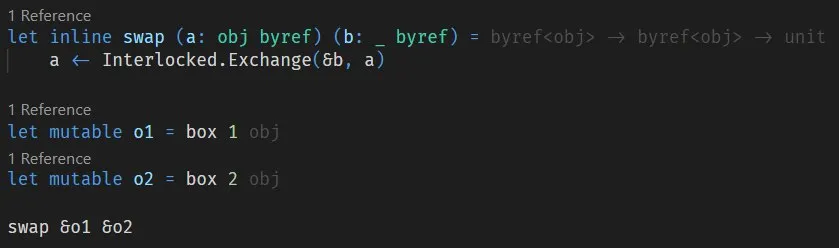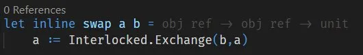 let inline swap (a: ref<'T>) (b : ref<'T>) : unit =
