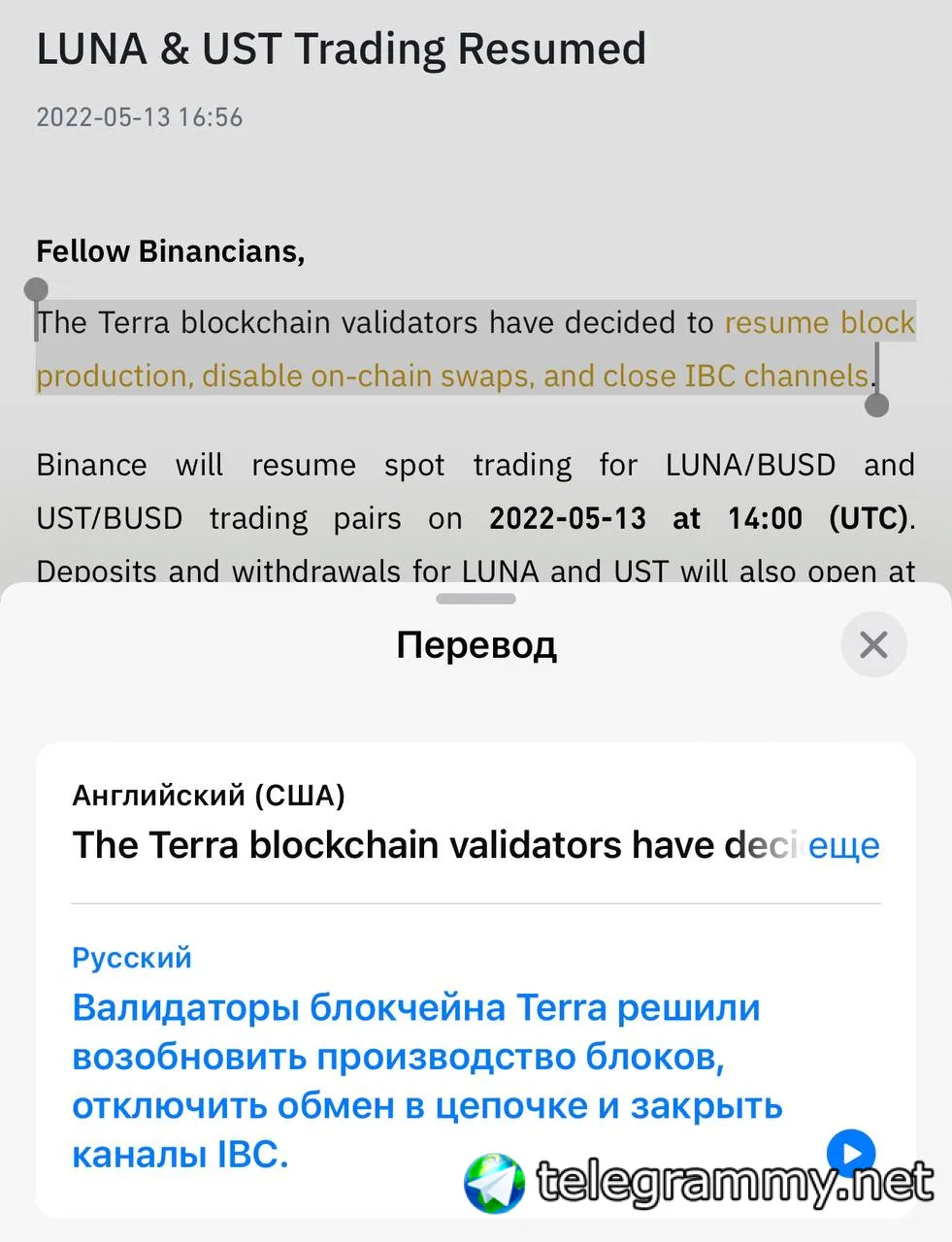 Binance возобновляет торговлю LUNA и UST в паре к BUSD. Депозиты и снятие также открывают.