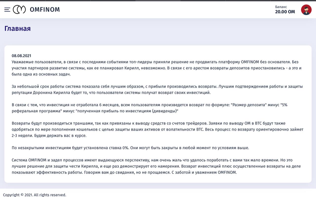 Уважаемые пользователи, в связи с последними событиями топ-лидеры приняли решение не продвигать платформу ОМFINOM без основателя. Без участия партнеров развитие системы, как ее планировал Кирилл, невозможно. В связи с его арестом возвраты депозитов приостановились - а это и была одна из основных задач.