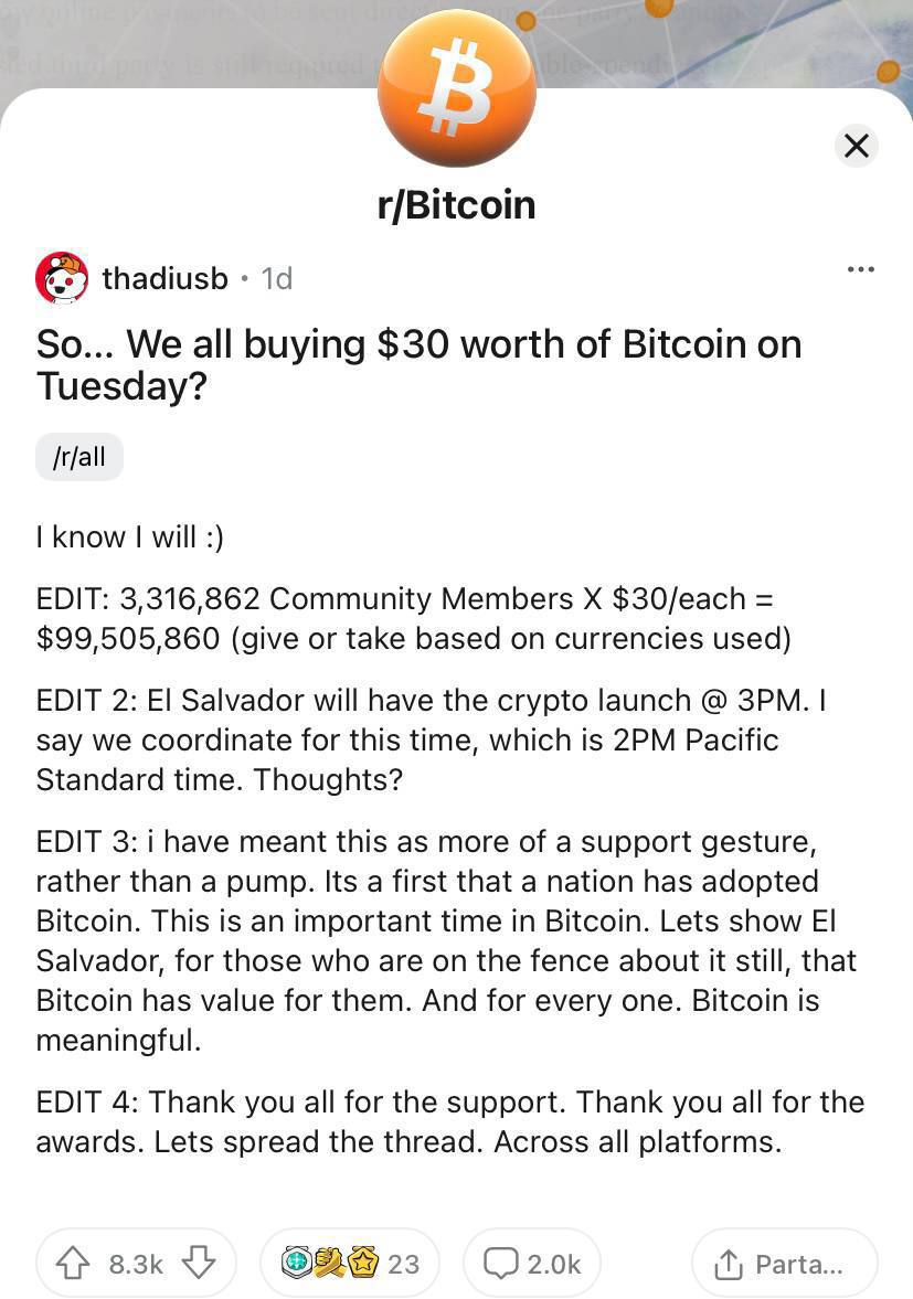 Сегодня в Сальвадоре должны официально ввести биткойн в качестве платежа. Для поддержки этого начинания, член группы Reddit/Bitcoin, в которой состоит 3,3 млн человек, предложил сегодня потратить 30 долл. на покупку биткойна в 24:00 по Москве (время принятия биткойна в Сальвадоре)