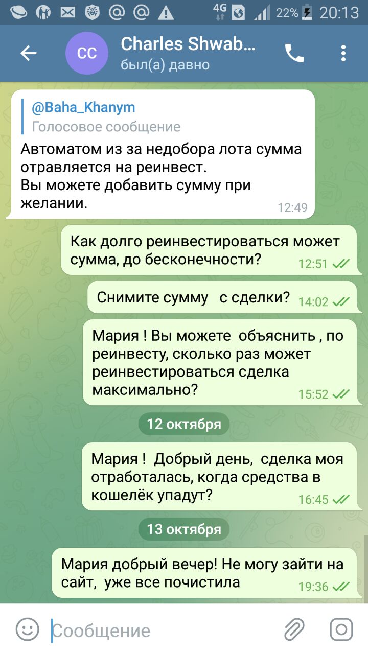 Они в последний раз, может быть 8 сделку нашу сумму три раза якобы на реинвестировали сами, потом сказали сайт на тех работах, в итоге не отвечают.