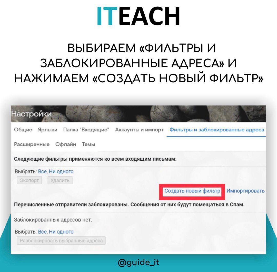 2️⃣ В настройках выбираем «Фильтры и заблокированные адреса» и нажимаем «Создать новый фильтр».