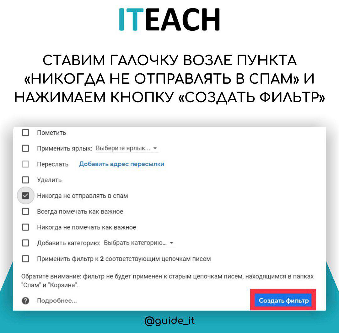 4️⃣ Ставим галочку возле пункта «Никогда не отправлять в спам» и нажимаем кнопку «Создать фильтр».