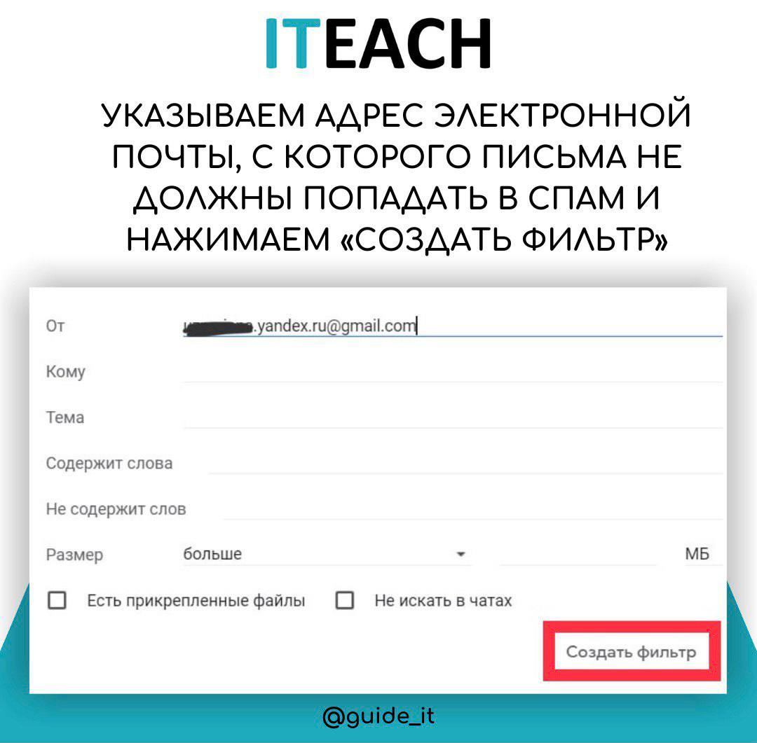 3️⃣ Указываем адрес электронной почты, с которого письма не должны попадать в спам и нажимаем «Создать фильтр».