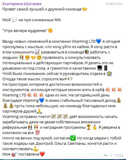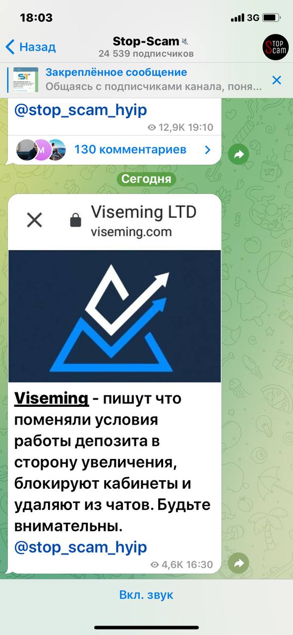 Viseming - пишут что поменяли условия работы депозита в сторону увеличения, блокируют кабинеты и удаляют из чатов. Будьте внимательны. В этом чате туда очень активно звали и зовут