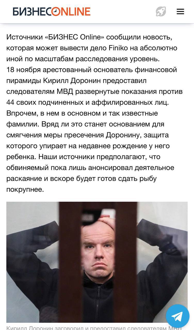 Основатель финансовой пирамиды Finiko Кирилл Доронин дал показания против 44 своих подельников. Как стало известно, сведения он предоставил следователям МВД.
