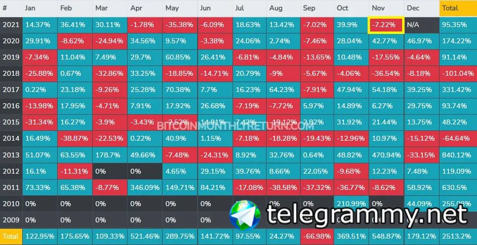 📊 Ноябрь закончился — по его итогам цена BTC упала на 7.2%. Всего за 2021 год первая криптовалюта выросла более чем на 95%.