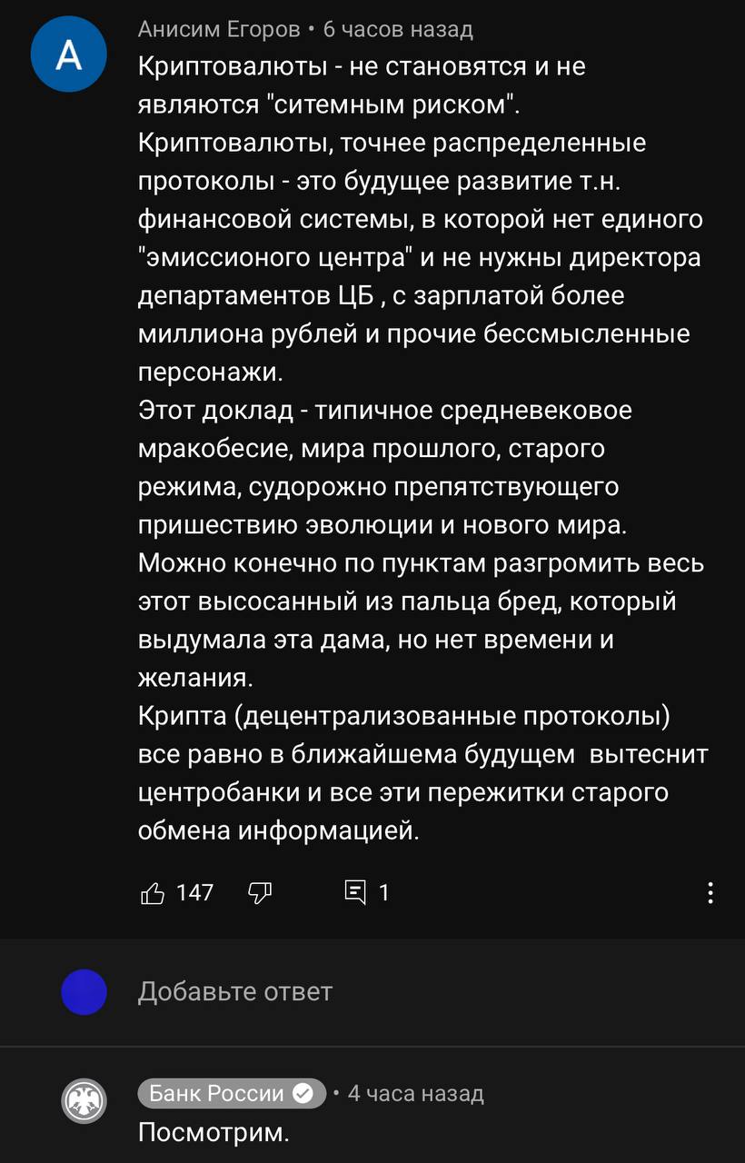 🤔 ЦБ в комментариях на YouTube отвечает на сообщения про криптовалюты.