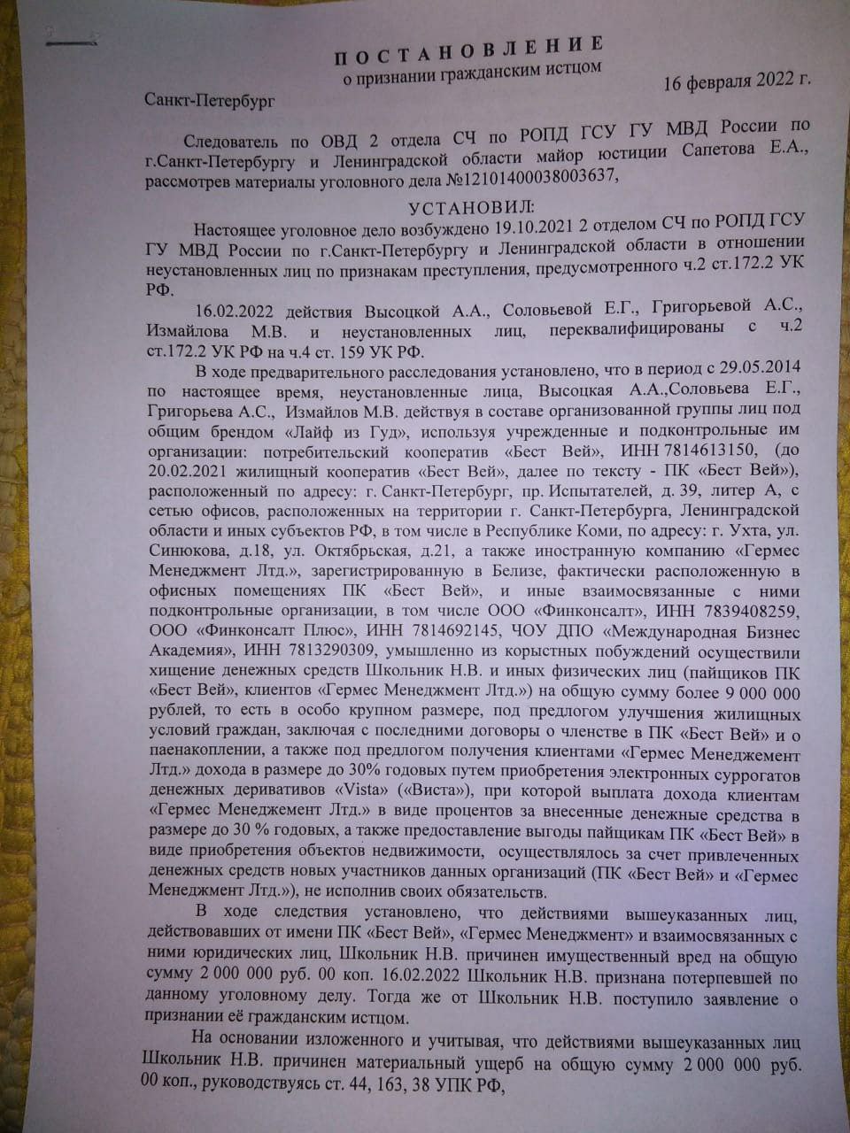 В нем фигурируют пирамидчик-лоховод Михаил Измайлов, помощница Василенко- Григорьева Александра; Высоцкая А.А.; Соловьева Е.Г. и другие неустановленные лица.