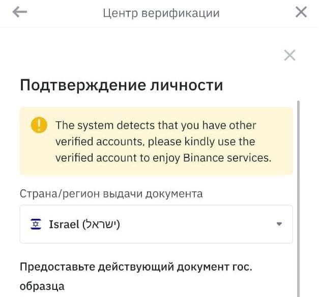 Я решил пройти верификацию на бинансе по другому паспорту, своему израильскому. Чтобы переложить свои крохи туда с аккаунта, верифнутого на ру паспорт.