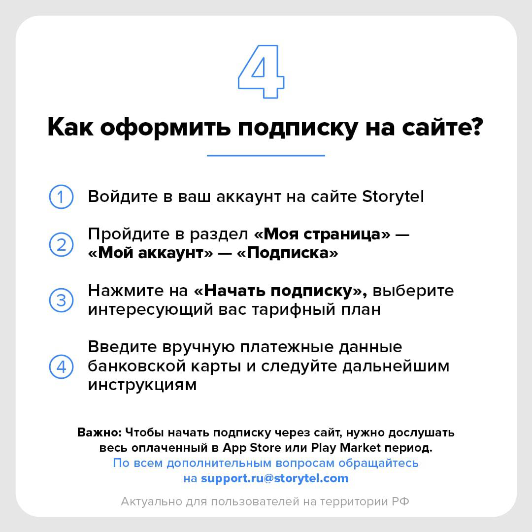 1. Через сайт: большинство сервисов уже обзавелись возможностью оплаты с карт, выпущенных российскими банками. У Storytel это можно сделать прямо на сайте.