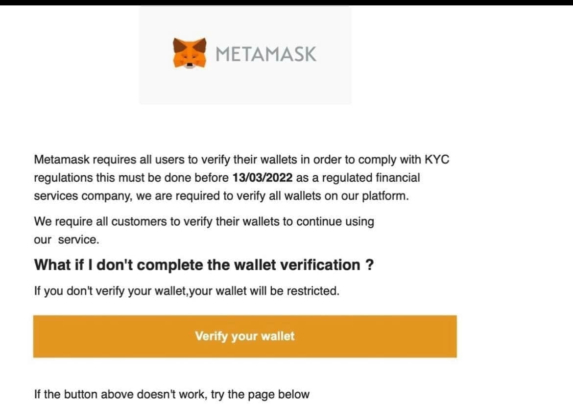 Кошелек MetaMask не требует верификации и работает автономно, а целью подобных писем являтся фишинг ваших данных.