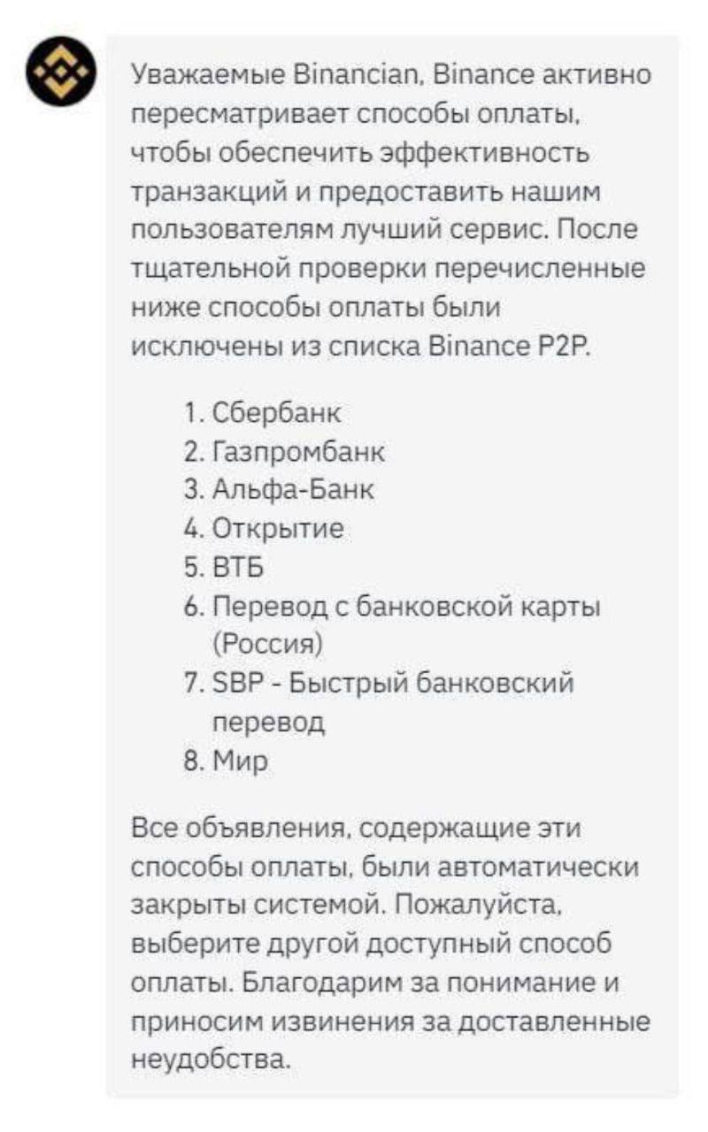 ⚡️ Binance ограничили часть способов оплаты P2P по РФ