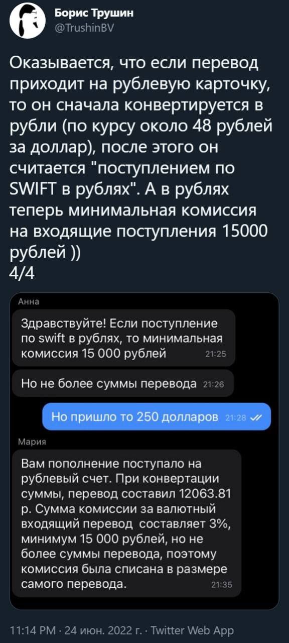 — Тинькофф Банк: бесплатно (по акции до 30.06.22, минималка 20 тыс usd), далее ожидается комиссия 1%. Перевод теперь до 8 суток обрабатывается!!!
