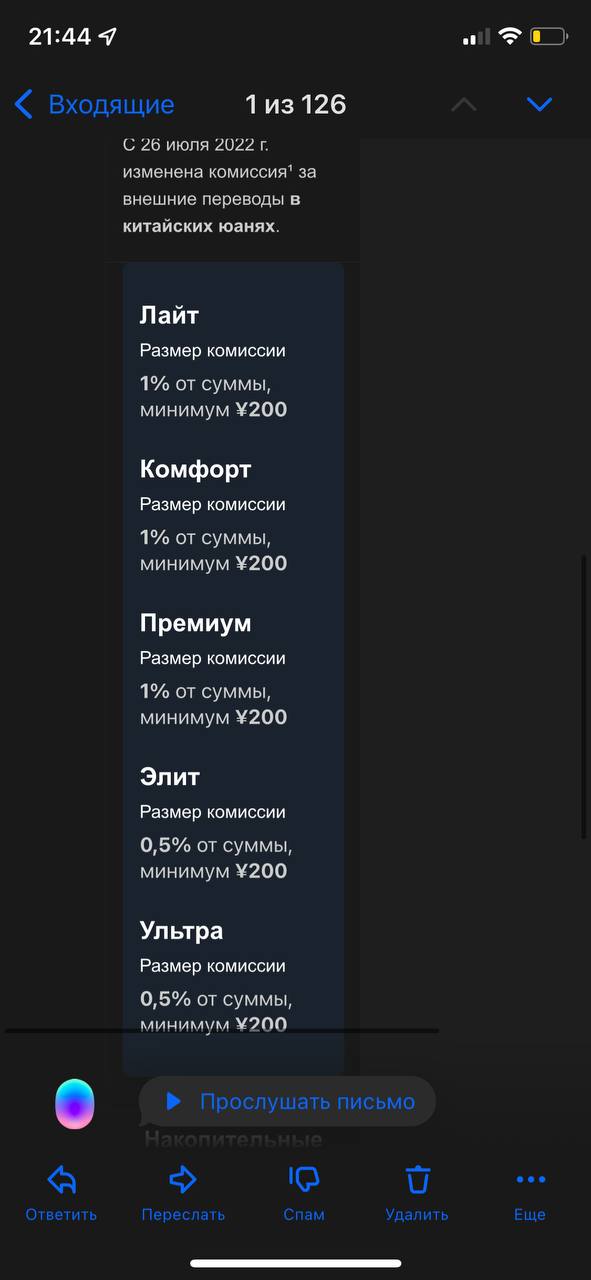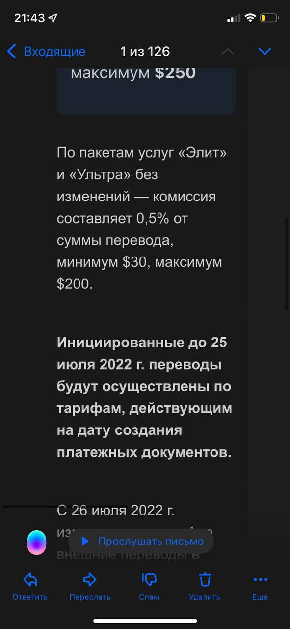 К примеру, на бесплатном тарифе банковского обслуживания «Лайт» размер комиссии за перевод долларов составит 3% (минимум 80$, максимум 250$). А на тарифе "Ультра" -комиссии не изменились (0,5% - минимум 30$, максимум 200$).