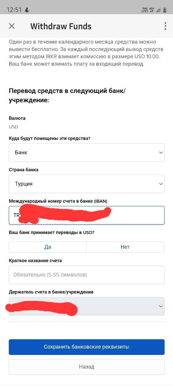 После того как указали, куда, в какую страну, и свой личный долларовый IBAN, IBKR автоматически подтянет данные вашего Ziraat Bank, а именно: