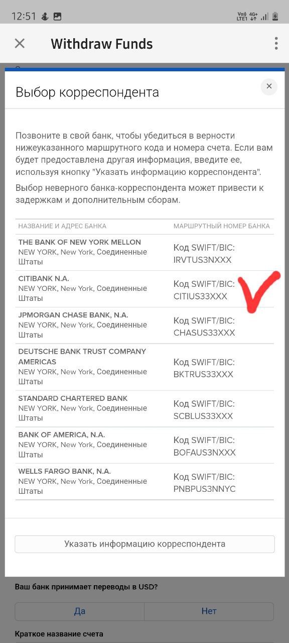 На вопрос принимает ли Ваш банк доллары? Отвечаем утвердительно, далее завершаем процесс настройки Swift перевода, там уже нужны будут чисто ваши данные от акк IB.