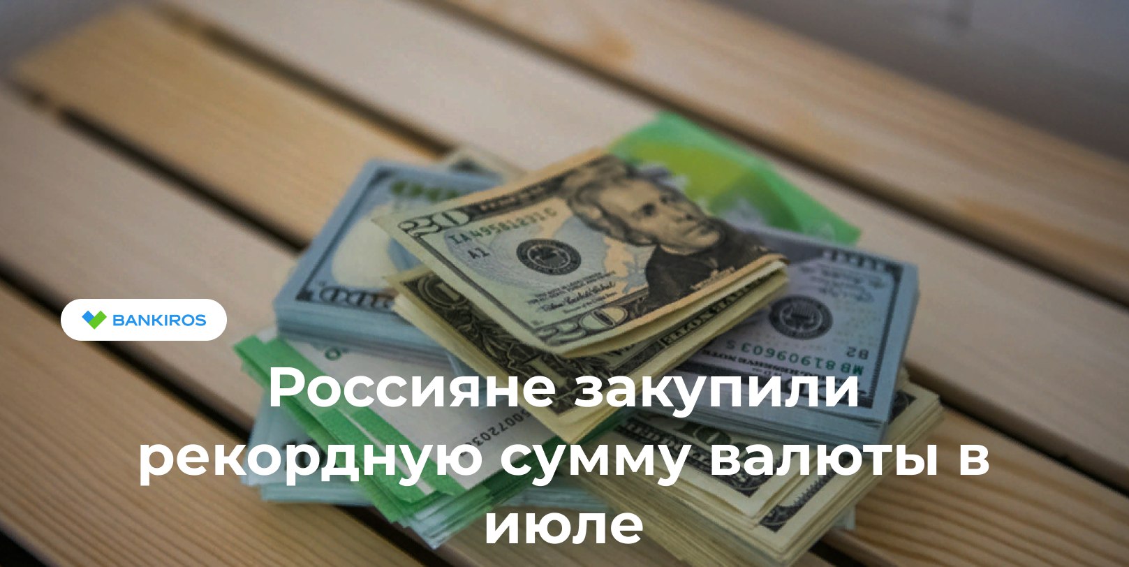 В июле россияне закупили рекордную сумму долларов и евро. По данным ЦБ, общая сумма с вычетом продажи иностранной валюты превысила 237 млрд рублей. Подробности в материале.