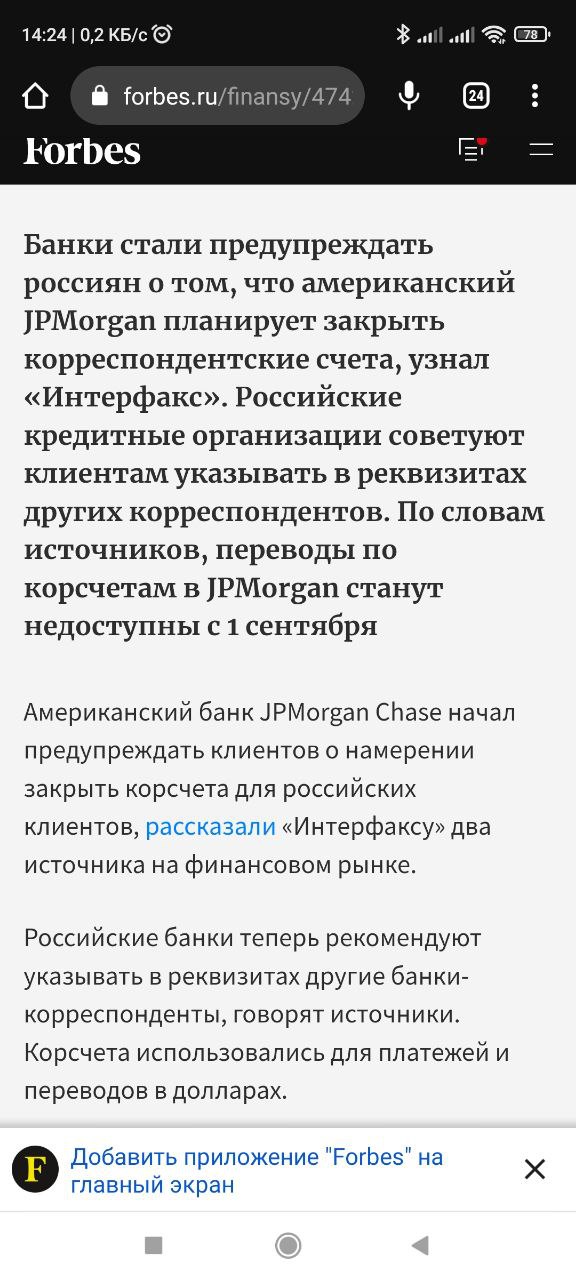 Привет. Подскажите плз, у кого есть инфа, что в итоге с корреспондентом БКС? В чате кто-то писал, что с понедельника 15.08 JPM закрывают счета российских банков, а БКС активно ищет себе на замену другой кор банк.