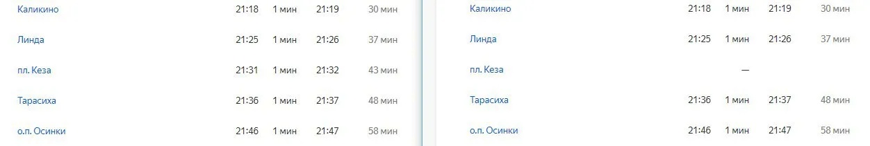 что характерно, убрали только кезу. А время следования и прибытие на станции не изменилось. Ни на секунду