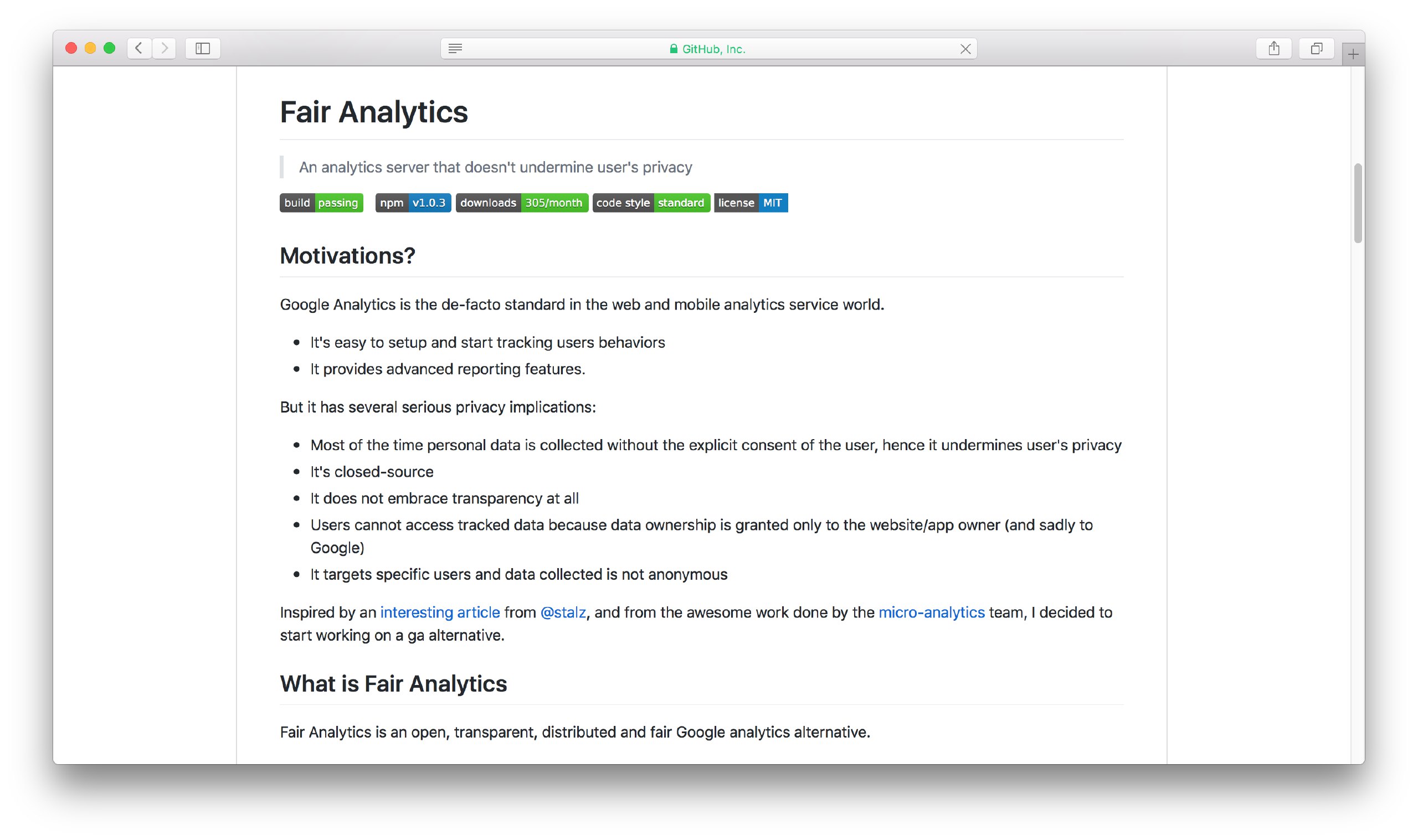 Fair Analytics, открытый опенсорсный self-hosted аналог Google Analytics, не нарушающий приватность пользователей — https://github.com/vesparny/fair-analytics