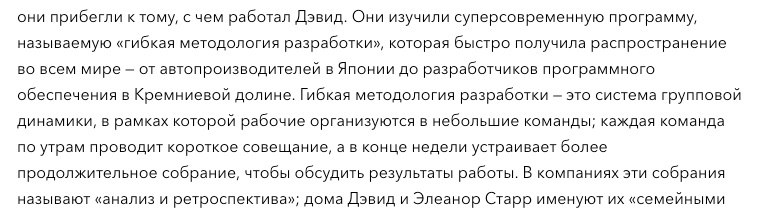 "Они отвели меня в кухню и показали висевшую на стене гигантскую блок-схему, которая была поделена на три колонки: НАДО СДЕЛАТЬ, В ПРОЦЕССЕ, СДЕЛАНО. В левой колонке НАДО СДЕЛАТЬ супруги приклеивали стикеры с задачами — «накормить животных», «сходить за продуктами», «созвониться по скайпу с Вероникой». Когда кто-либо брался за конкретную задачу, самоклеящийся листочек перемещался из первой колонки во вторую, а когда задача была выполнена — в третью."