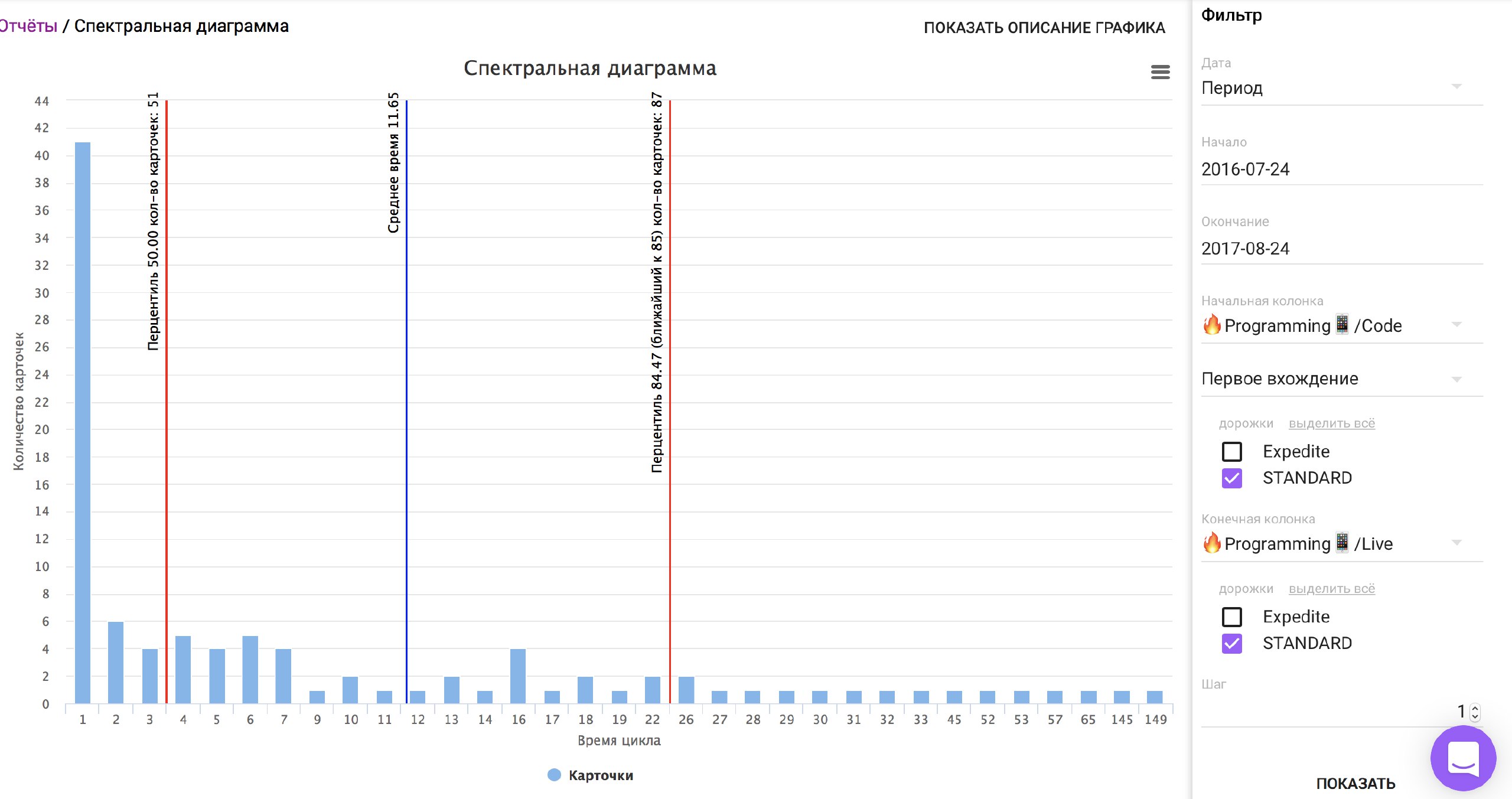 Средняя время здесь - это синяя черта, а крайняя правая это 85% задач за какой промежуток времени делаются - вот это более правильная метрика.