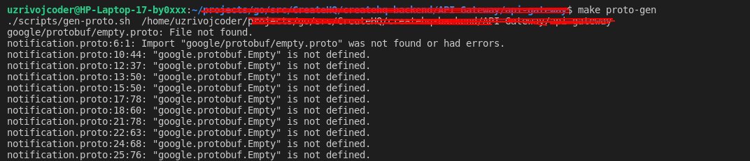 Well, I have some proto files in several service folders but However, no proto files were imported into each other. I used this import "google/protobuf/empty.proto"; in order to write Empty to the rpc function's response space. To be frank with you, I cloned this project from gitlab, and when i try to write make proto-gen command, it causes:
