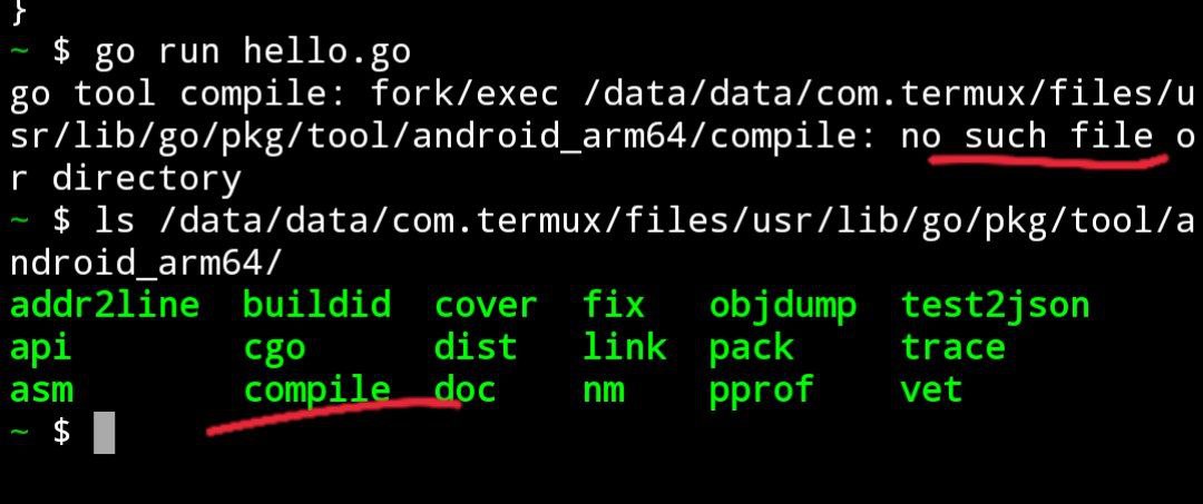 С недавнего времени у меня проблемы с запуском кода на GoLang в термукс.. при запуске пишет, что файл компилятора отсутствует, но он есть, что можно увидеть на скриншоте: