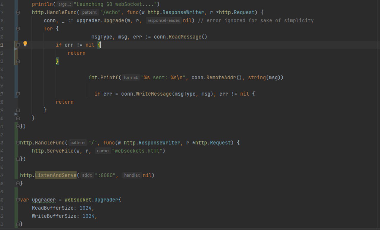 родной пример почему не пробуете? https://github.com/gorilla/websocket/blob/master/examples/echo/server.go