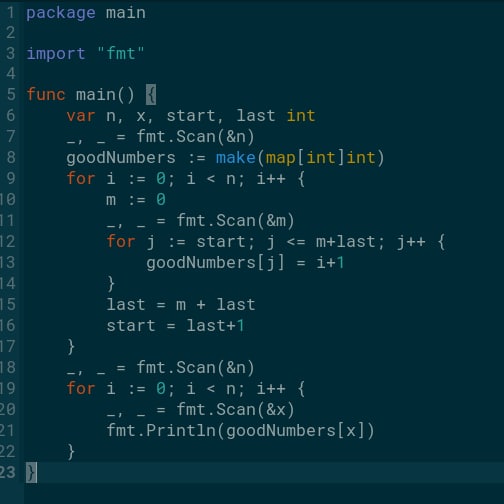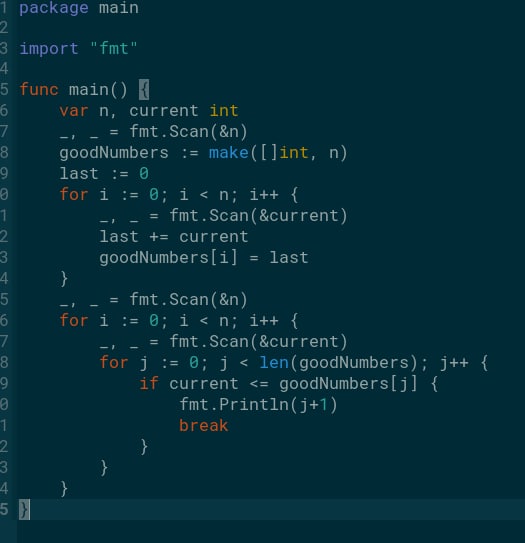 создаем массив, аппендим в него все данные от 0 до последнего значения кучи(через прибавление) и везде ставим номер кучи, а потом по номеру товара просто номер кучи получаем