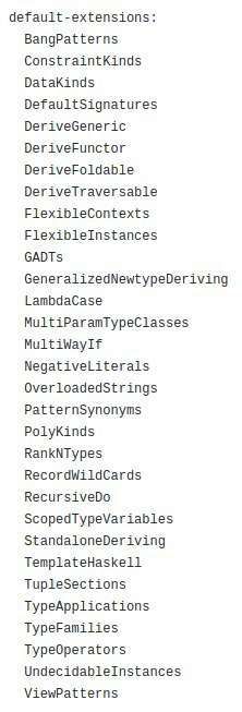 Я все думал, что когда-нибудь выйдет Haskell20XY, который будет Haskell2010 со смерженными в него самыми частыми расширениями