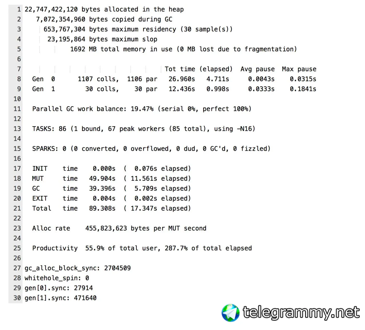 блин, похоже я что-то не то делаю: процесс хаскеля грузит все 16 ядер на 100%, GC что-то дико чистит, хоть я и запускаю с +RTS -A6M. Скомпилировано с -threaded -rtsopts -with-rtsopts=-N