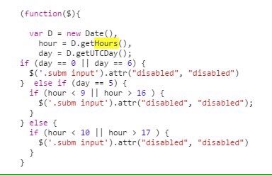 JavaScript код, размещенный на странице, блокирует кнопку все время кроме как по с понедельника по четверг с 9 до 17 и в пятницу с 10 до 18. Единственный способ пожаловаться — отключить JavaScript в браузере на время отправки формы.